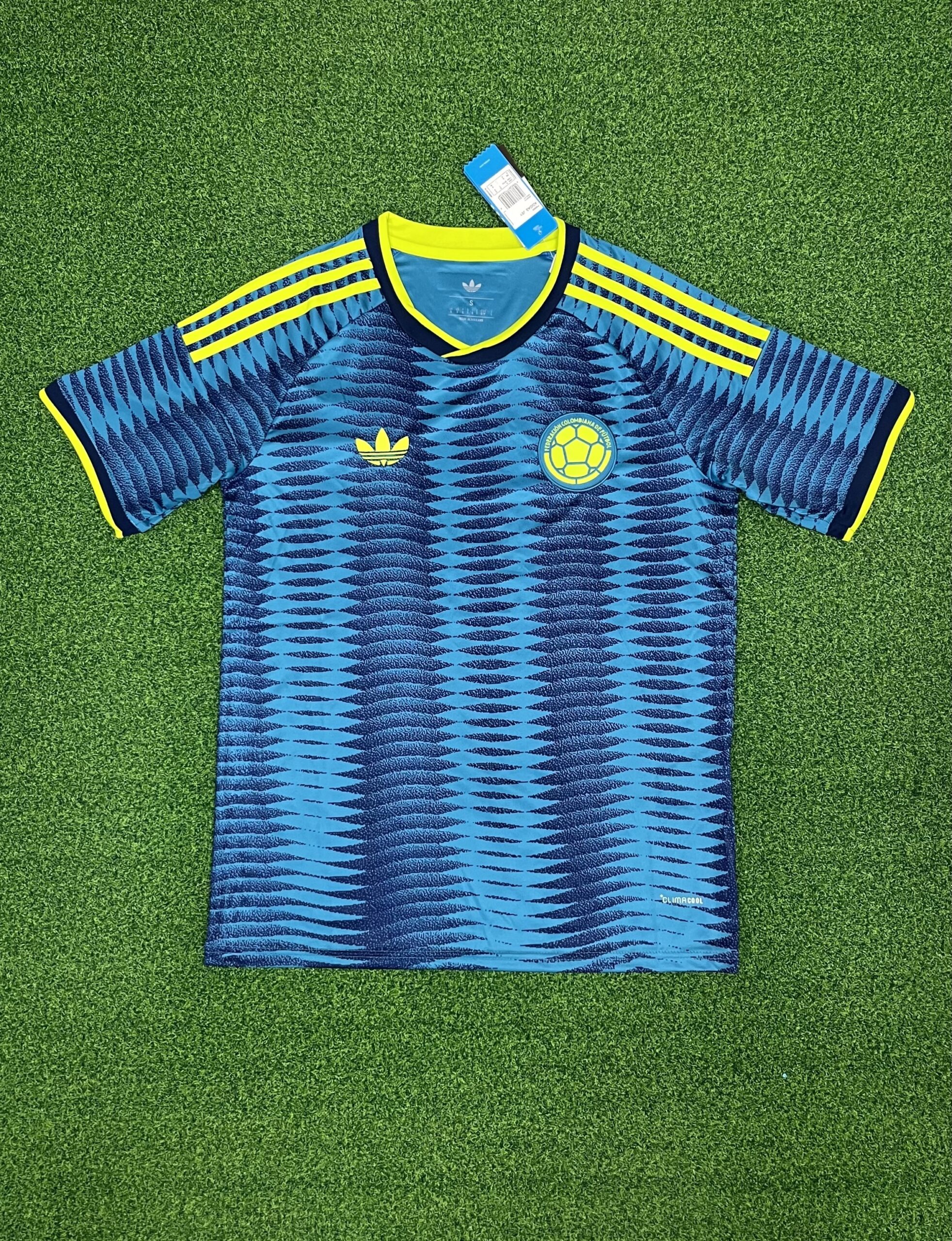 - Design: The Colombia 2026 World Cup away jersey combines ‘Team Navy Blue’ with a darker mint-blue shade pattern and uses yellow for the logos.