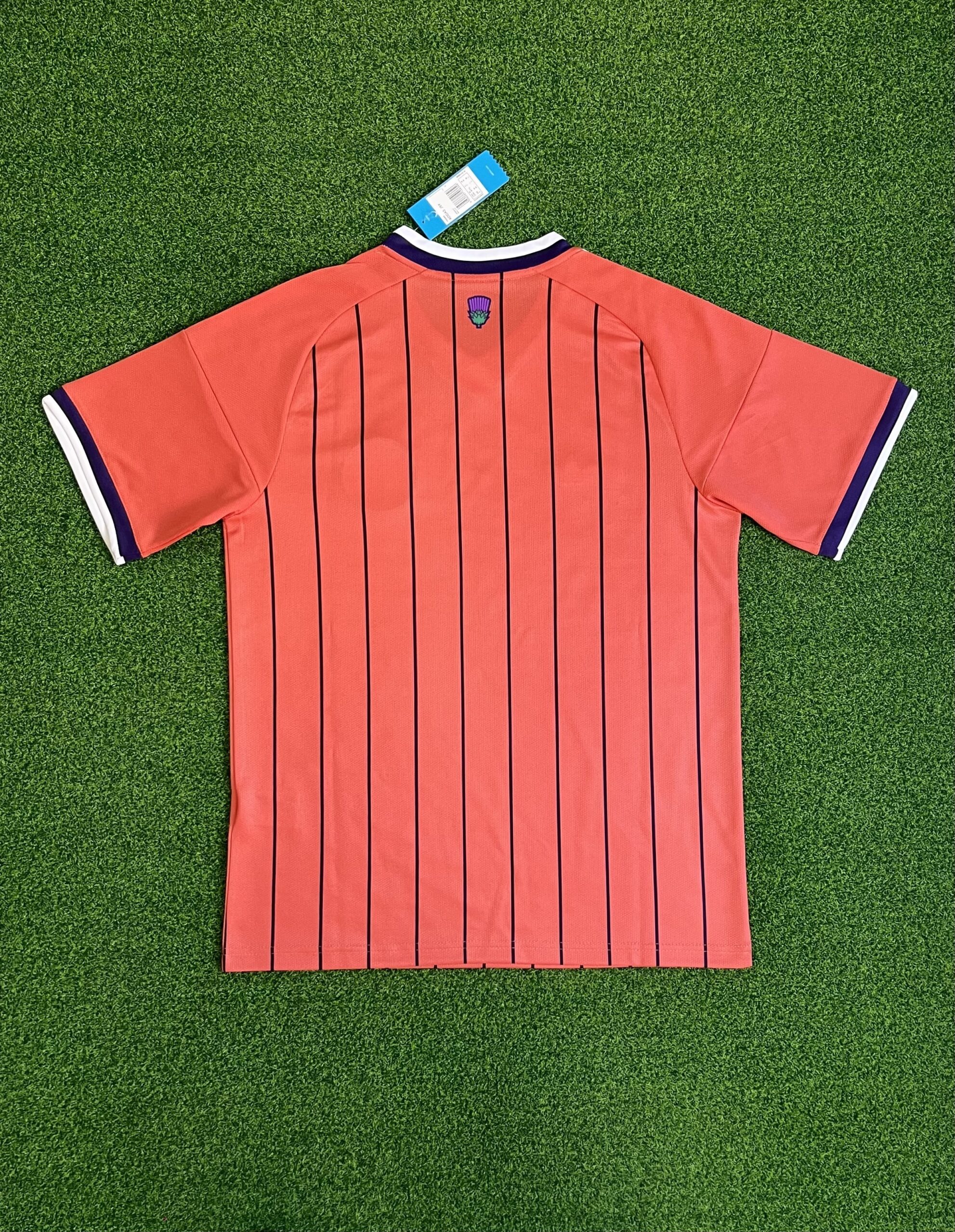 Update: Scotland has officially unveiled their new 2026 World Cup away jersey, featuring a combination of vibrant colors and subtle stripe patterns. Scotland’s new 2026 away kit will be worn at the 2026 FIFA World Cup in the USA, Mexico, and Canada. The Tartan Army last appeared at a World Cup back in 1998 in France. The new Scotland 2026 World Cup away jersey introduces a “Trace Scarlet” (light coral) base, paired with navy detailing to create a stylish and nostalgic aesthetic. The closest precedent dates back to the 1999 Umbro away shirt, which also featured a similarly vibrant tone, though not as coral-like as the 2026 design. The design of the Scotland World Cup away kit is enhanced by thin navy blue pinstripes running vertically across the front of the shirt, giving it a subtle yet elegant pattern. Unlike the bold, thick three stripes seen on the 2026 home shirt, the Scotland 2026 World Cup away shirt features standard-sized three stripes in white across the shoulders, reinforcing the retro theme while keeping the look clean and balanced.